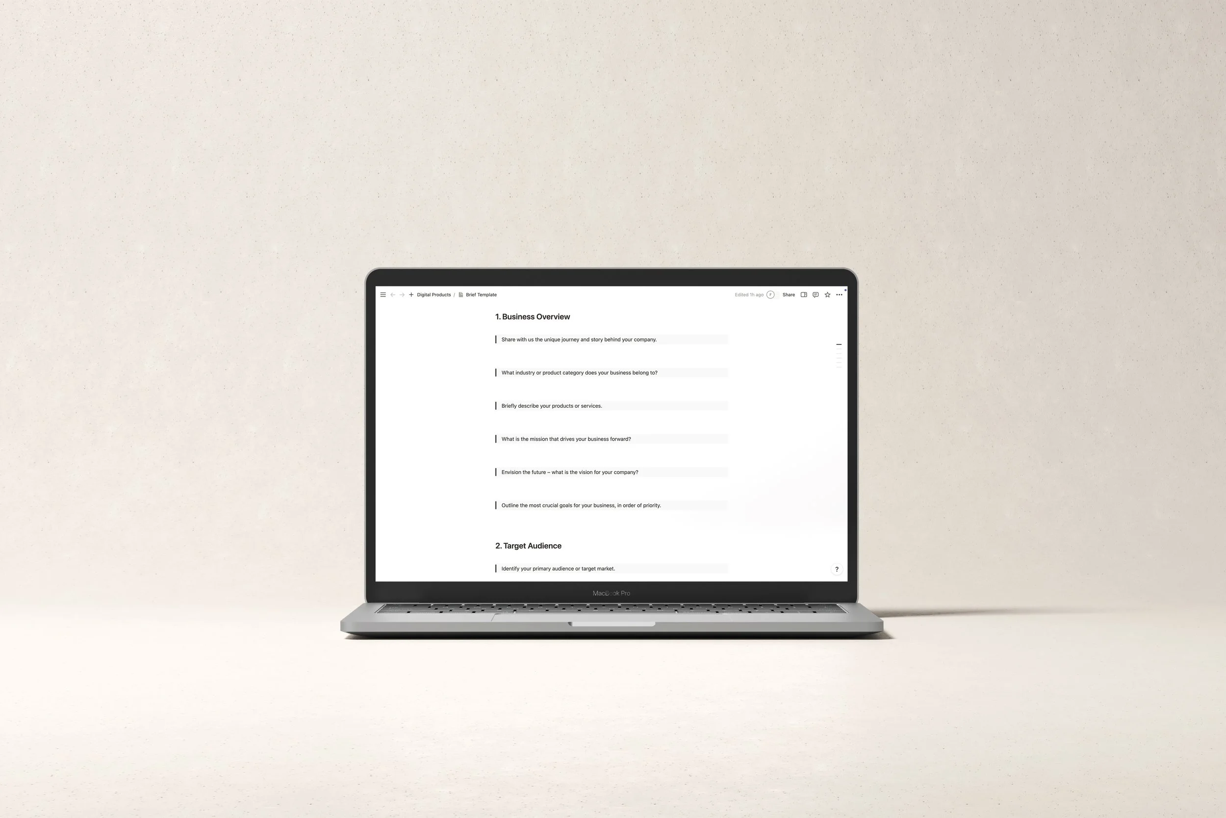 Clear and organized structure - 5 essential sections to define any design project.Easy to duplicate and customize - Adaptable to any need or workflow.Real-time collaboration - Share with clients or teams to keep communication aligned.Accessible from any device - Use Notion on your computer or mobile.